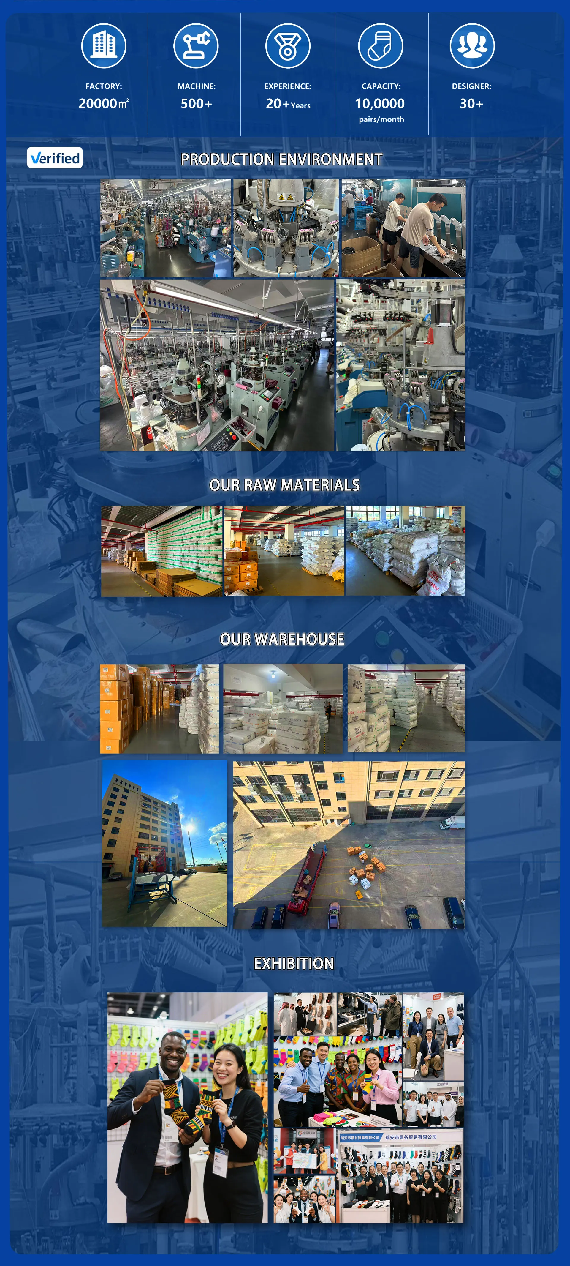 The company was founded in 1994, with a construction area of over 10,000 + square meters, more than 100 employees, over 160 imported computerized sock knitting machines, and more than 30 sets of various auxiliary equipment. Currently, the company mainly produces socks of various specifications made from materials such as combed cotton, mercerized cotton, bamboo fiber, modal, organic cotton, wool yarn, and fine nylon, covering three major categories: men's socks, women's socks, and children's socks. The company has an annual production capacity of over 10 million pairs, 80% of which are for export.